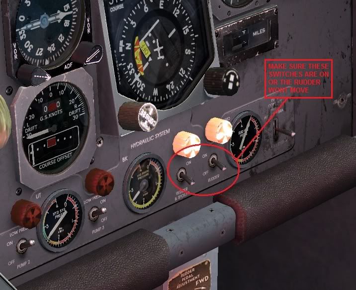 From the manual: ‘707 Captain’ FLIGHT MANUAL Part II – Aircraft and Systems (cs707_manual2.pdf) pages 37-38 R17. HYDRAULIC SYSTEM PANEL 9,10. AC Auxiliary Pump Switches When positioned to ON: Activates pump motor. OFF: Shuts off pump motor. Switch No.1 is powered from an AUX PUMP CONT No. 1 CB on P5, TR bus No. 4, the No.2 switch from an AUX HYD PUMP CONT-2 CB on P5, TR bus No.3. Make sure that switches 5, 7, 9 and 10 are ON (they are OFF when you load the 707-300 Cold-n-Dark (KSEA).FLT! When switches 9 and 10 are OFF, the rudder wont move. In this image, the AC Auxiliary Pump Switches (9 & 10) are OFF and so my rudder doesn't move. Hope this helps Mark |