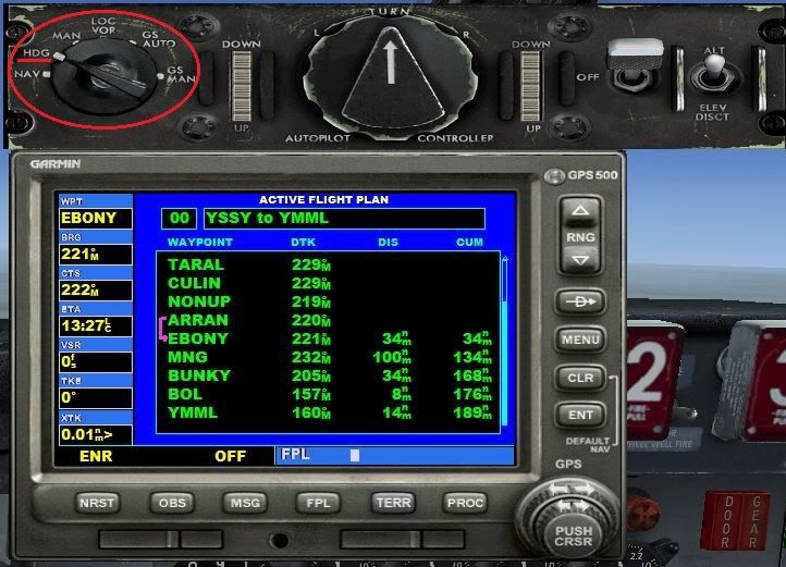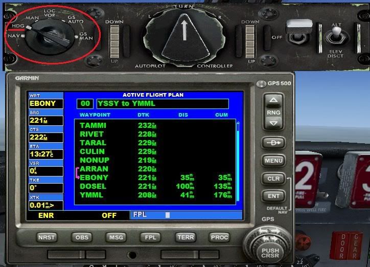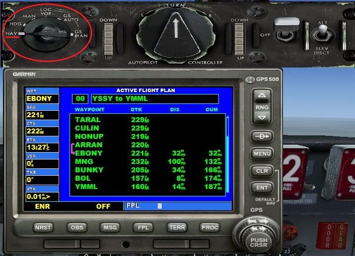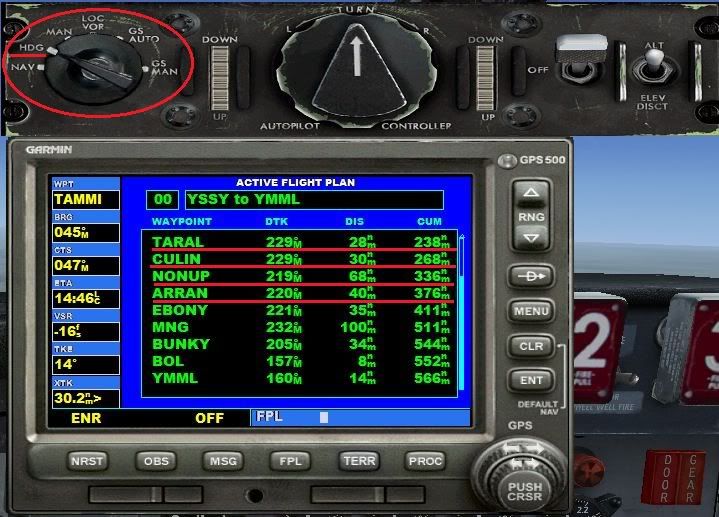 The only way that I know of to change which waypoint you want to head to (that I know of), is using the default GPS. How to add the default GPS: Open the panel.cfg with Windows notepad. In [Window Titles] add the following line (bold text): [Window Titles] Window00=Simicons Window01=Animations Control Window02=CS Weather Radar Window03=Map Window04=Autopilot Window05=Crew Messenger Window06=GPS Then add the bold text part below [Window05] and before [VCockpit01], like this: [Window05] size_mm=349,218 window_size=0.25 window_pos= 0.030, 0.690 background_color=0,0,0 visible=0 ident=11005 render_3d_window=0 gauge00=Captain_Sim.x707.P15!P15_voice, 0,0, 349,218 [Window06] background_color=0,0,0 size_mm=303,283 position=2 visible=0 ident=GPS gauge00=fs9gps!gps_500, 0,0,303,283 [VCockpit01] size_mm=1024,1024 pixel_size=1024,1024 texture=$FPSP background_color=0,0,0 gauge00=Captain_Sim.x707.R01!R01_001_light, 625, 824, 56,55 gauge01=Captain_Sim.x707.R02!R02_clock, 50, 300, 155,151 gauge02=Captain_Sim.x707.R03!R03_aplight, 625, 750, 55,55 gauge03=Captain_Sim.x707.R05!R05_rmi, 275, 775, 200,200 *This is not the panel.cfg with the CIVA INS panel Now you have added the GPS, we will assume that you are in mid flight and have added the STAR/TRANS to the revised flight plan. DO NOT LOAD IT YET! Now place the HDG Bug at the top center of the HSI and turn the Autopilot MODE SELECTOR SWITCH to HDG so that the 707 continues towards its current waypoint. Here I have switched the Autopilot Mode Selector Switch to HDG Now load the revised flight plan. New plan loaded, but all the early waypoints are not finished. The Autopilot in NAV mode would head for waypoint 1 (notice I am still in HDG mode! Open the default FS GPS (if you followed my instructions use SHIFT+7). Press the FPL button to call up the Flight Plan. Press the PUSH CRSR button on the GPS and scroll down to the current waypoint (the one you were heading towards in the first plan). Notice that I have highlighted the waypoint I was originally headed towards before the revised plan was loaded Press the MENU button, and it display a box that says (what I see using my demo flight plan): FLY LEG TARAL --> CULIN ACTIVATE? <- this is highlighted and flashing Press the ENT button and that leg of your flight plan is now active. The flight plan leg to my current waypoint is now activated (see that the previous waypoints are clear) but I'm still in HDG Mode Now turn the Autopilot MODE SELECTOR SWITCH to NAV and the 707 will continue as if nothing happened. All back to normal and my 707 has not skipped a beat. She has continued on as if nothing has happend I hope this helps you with your flights, especially after you have revised them to include STAR and TRANS. And to those who shudder at the thought of putting the default GPS in an aircraft, think again. This is a most helpful tool to have in the CS707 because of the fact that it can follow an FS flight Plan. ;) Mark Note: You can learn about the FS GPS in the Help > Learning Center > GPS > using |