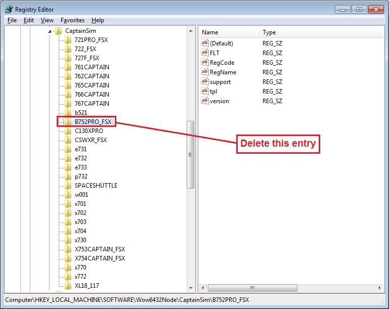 3. Find the product entry in HKEY_LOCAL_MACHINE\SOFTWARE\CaptainSim\ (please note, for Windows 64bit versions it is HKEY_LOCAL_MACHINE\SOFTWARE\Wow6432Node\CaptainSim\)