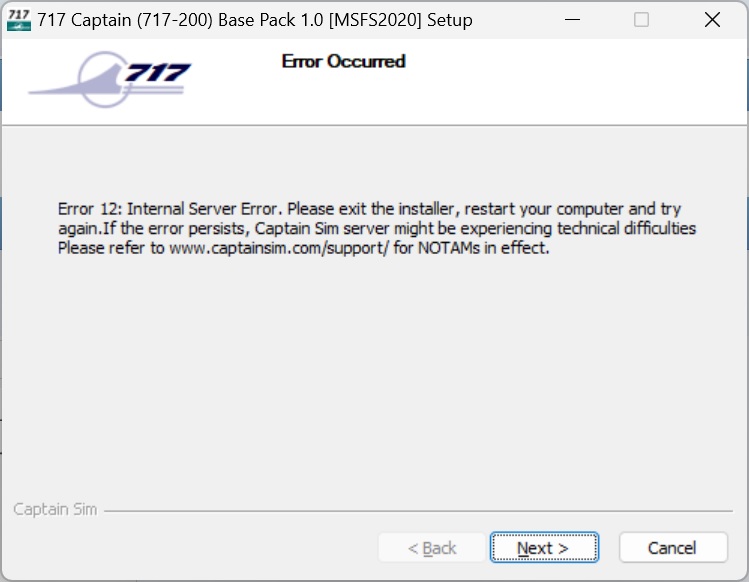 I cannot install the 717, error 12. Even stopping Windows Defender, re-downloading the .exe file, using administrator privilegues or restarting the computer helps.