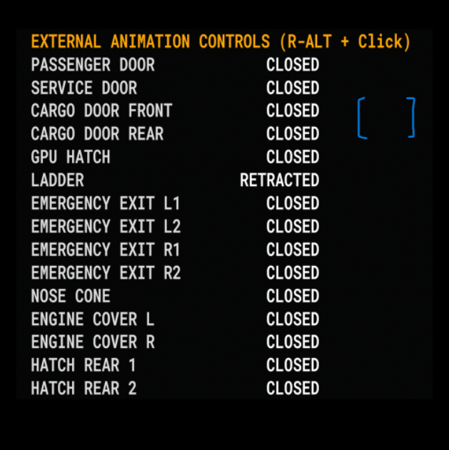 Re: doors... are y'all using the updated version? The initial rollout was pretty bad, but it was adjusted on the first update. There are also cargo doors on the external animation controls, options 3 and 4. It's a clunky system, but to open the doors you have to be in the cockpit and Right-Alt & Click on the display screen to open the external window. The clickspot to open or close the doors is to the right of the status (Open/Closed). Not super user friendly, but it does work.