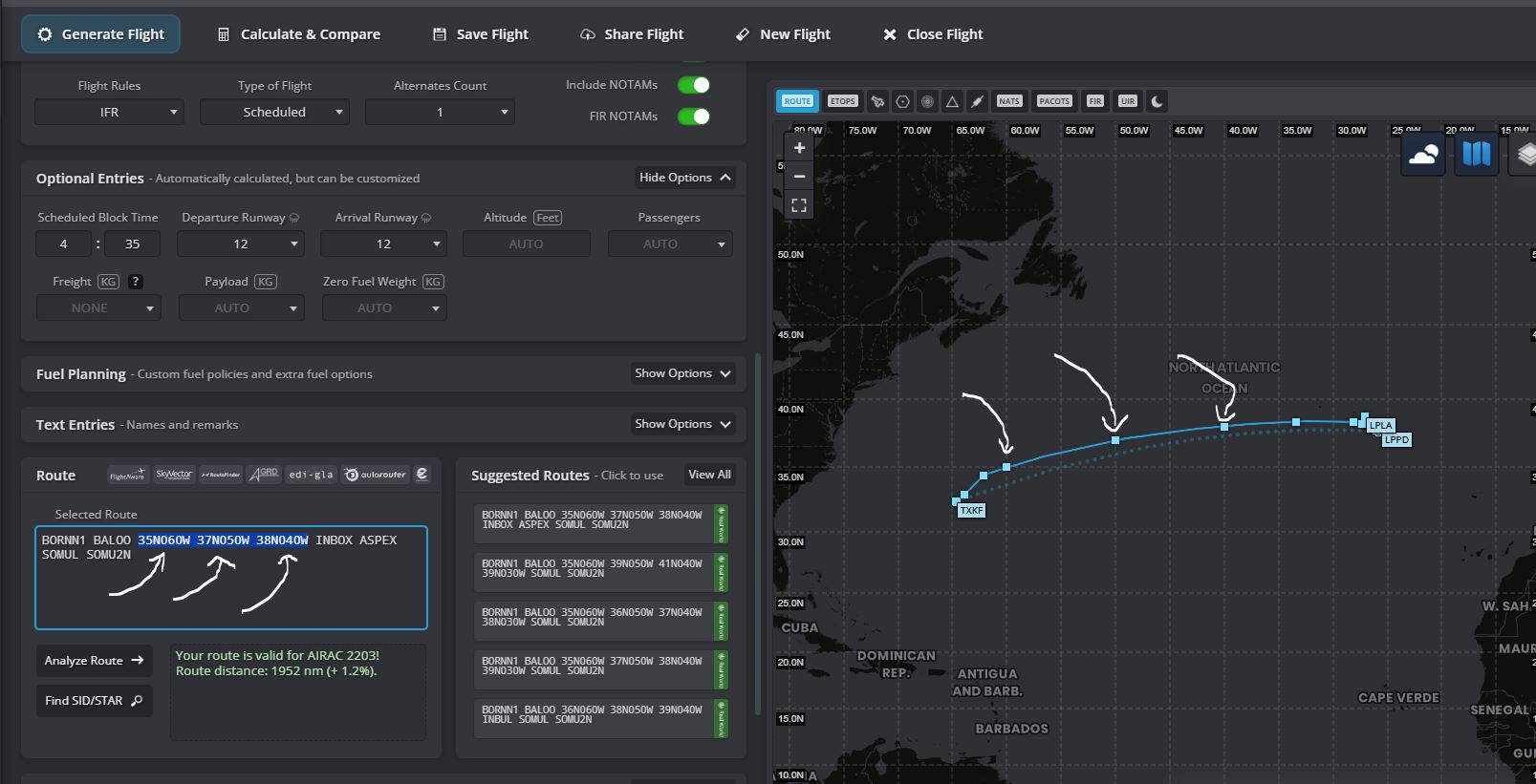 So... I spent some time looking into it, and I think the best way to do it would be to create 3 waypoints (just drag the red line and release (it creates the waypoint - named WP1, WP2, and WP3)) in the middle of the flight plan. The worst part of this is that the Intersections/Fixes in P3D might be different to the real world ones, and adding all of them might be difficult, because without the connection accros the North Atlantic Tracks, you might not be abl to creat a plan. In the end, using the CS767 FMC to creat the plan might be the better option, but then you would need to enter the coordinates for the start/end of he tracks, plus those 3 you show in the second image. Not fun IMHO.